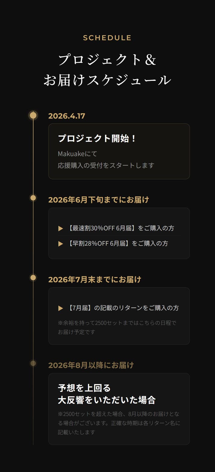 このプロジェクトはAll in型です。目標金額の達成に関わらず、プロジェクト終了日の2026年07月12日までに支払いを完了した時点で購入が成立します。