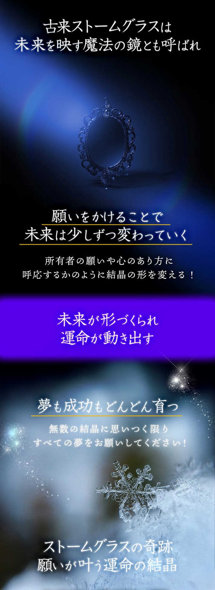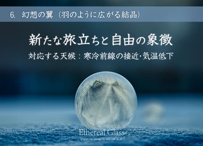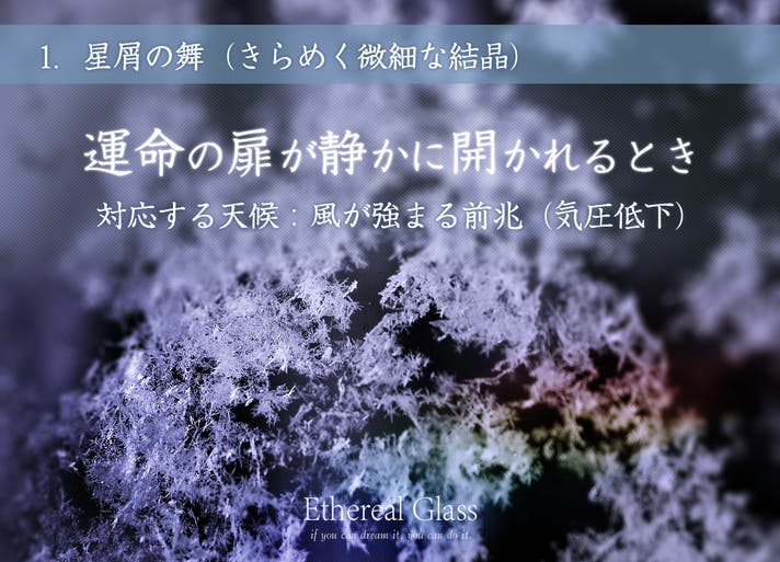 静寂の中で、まるで雪の結晶のように広がる美しい結晶たち。それは、あなたの心の奥にある”夢が形になり始めた証”とされ強く願えば、世界が想いを受け止めて道を開いてくれます。