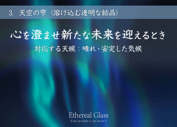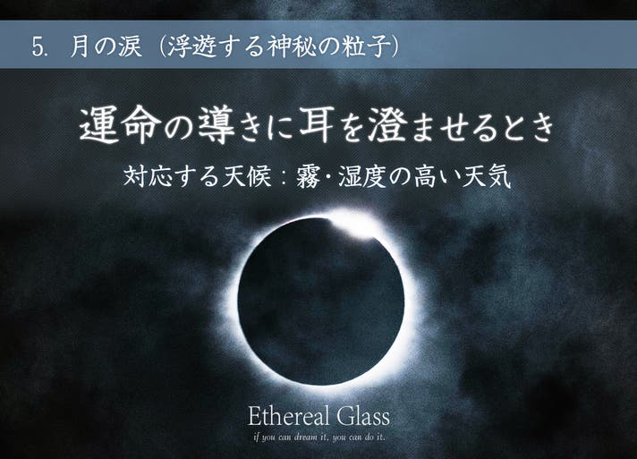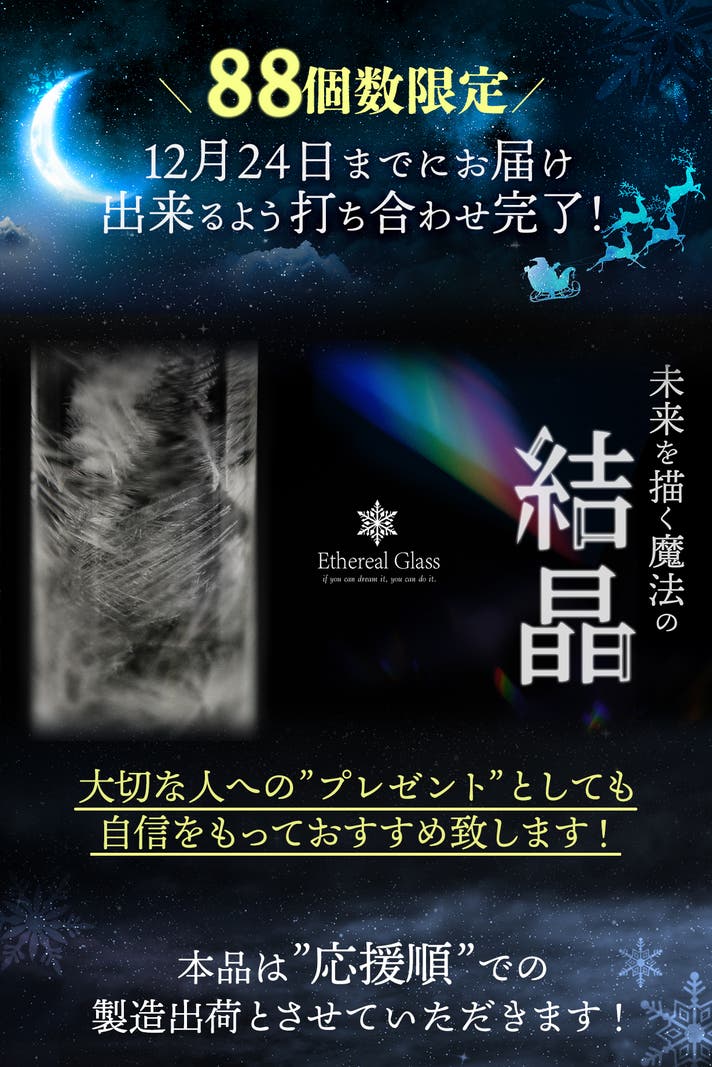 結晶に思いつく限り、すべての夢をお願いしてください!もちろん、叶う順番は選べませんが「大きな夢も・小さな夢も」Ethereal Glassは夢が叶う手助けをする、そんな願いが込められたお守りです!