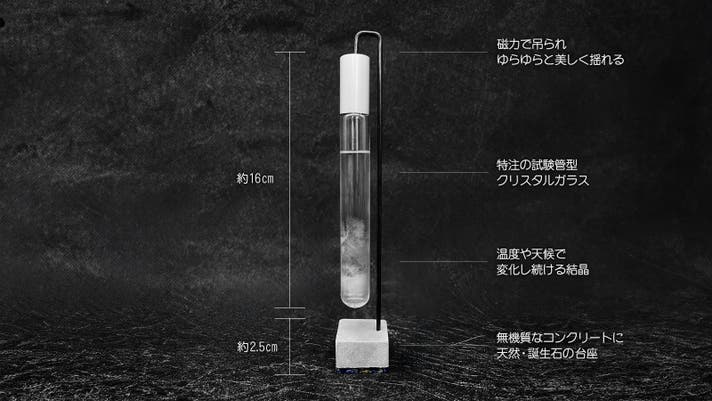 インテリアとしての美しさとわくわくする仕掛け、宙に浮かぶ結晶を閉じ込めた試験管。