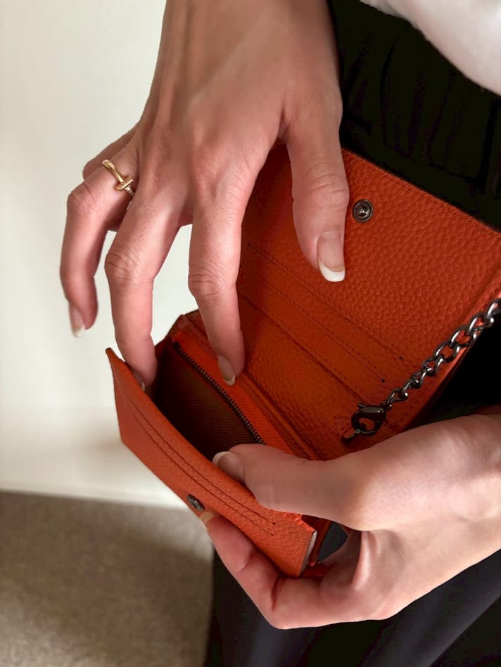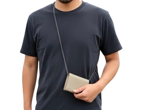 チェーンで胸元や体の前に固定すれば、スリ・置き忘れ・落下のリスクを大幅に減らせるため、安心して持ち歩けます。