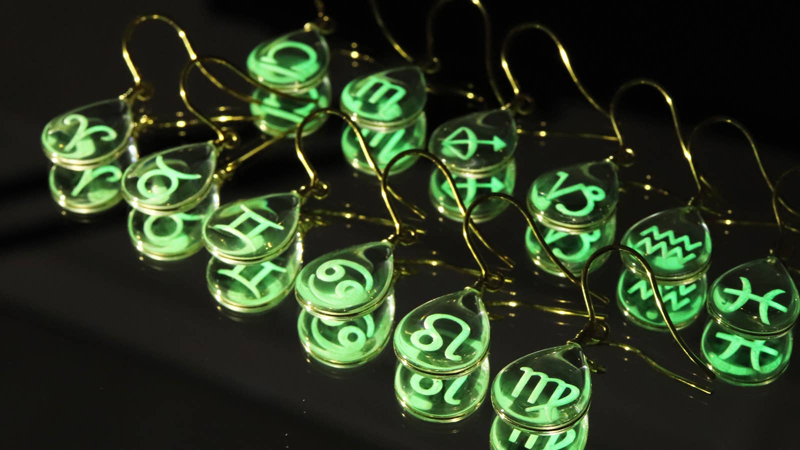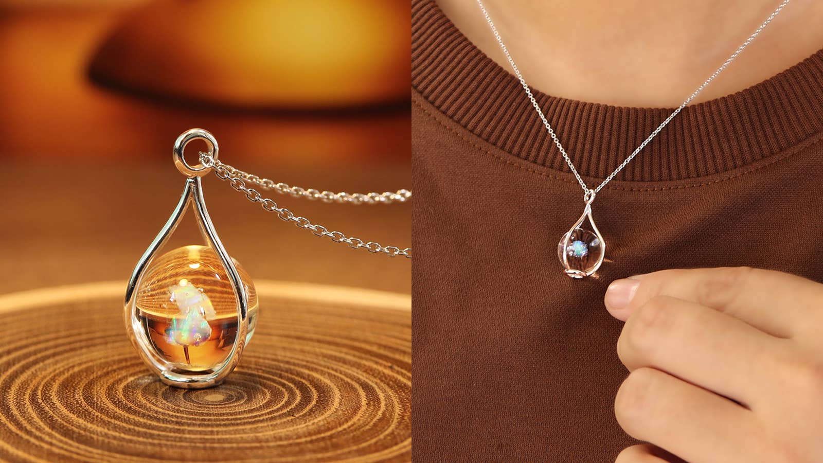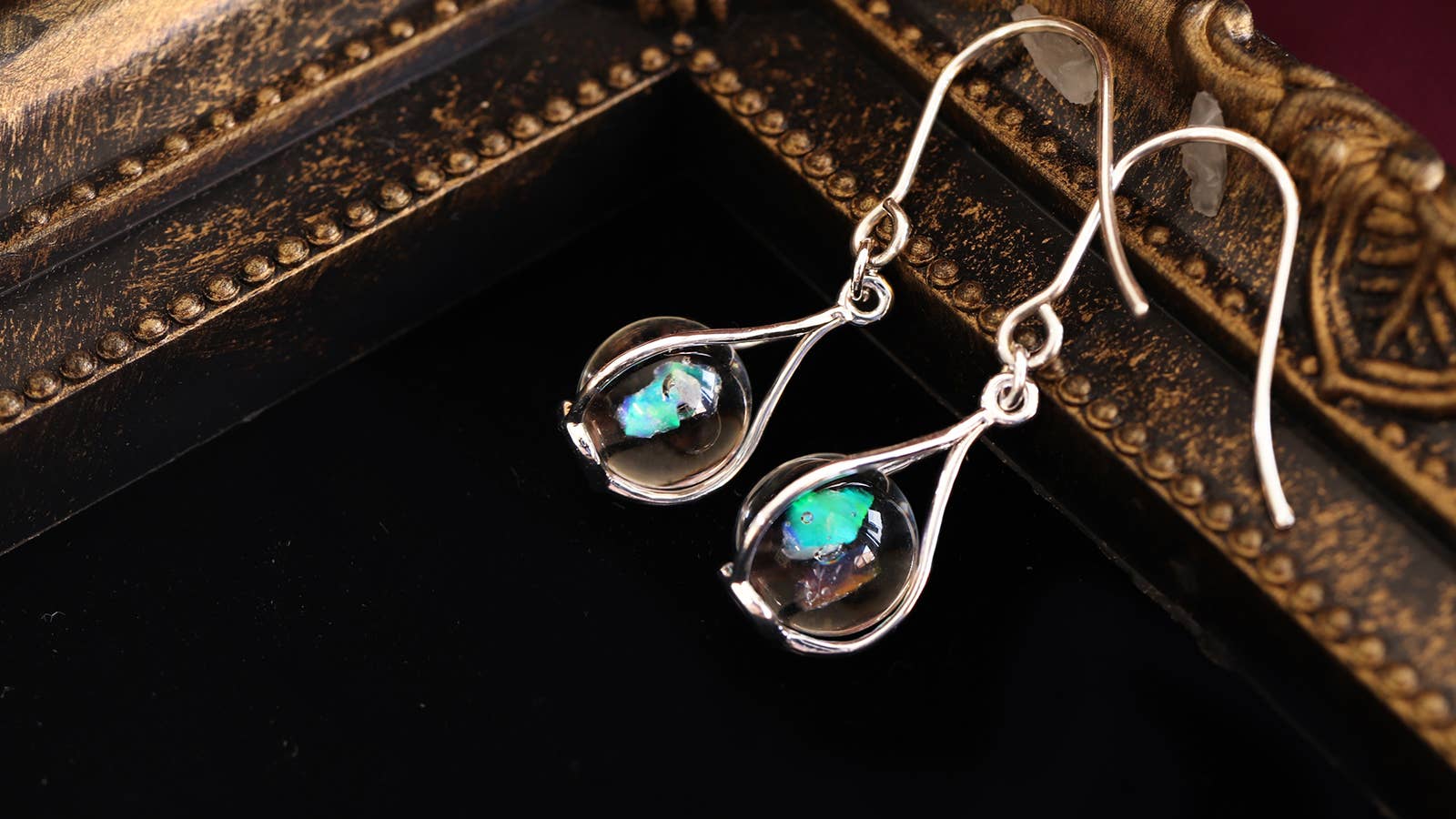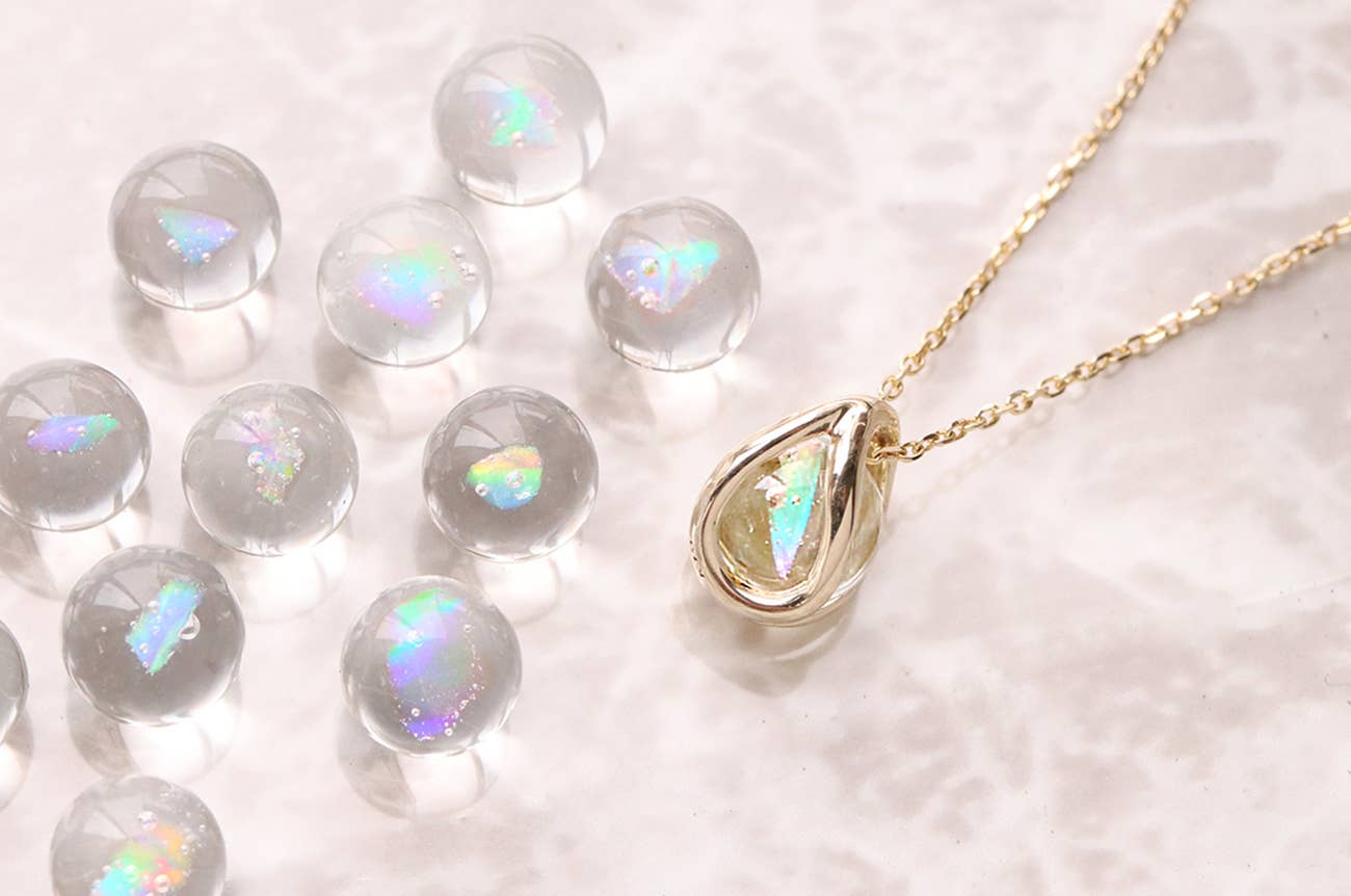 ガラスに閉じ込めたオパールのカケラが、光を受けてランダムな虹色に輝きます。