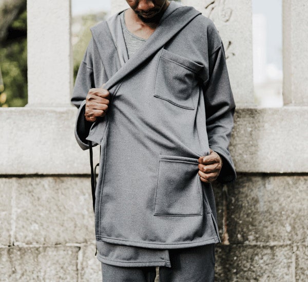 日本の伝統的な「作務衣」は、元々作業着にも使われ、動きやすいシルエットを確立しています。そんな作務衣を現代風に構築し、機能性のある高級フリース素材と組み合わせることでさらに動きやすく、日常を快適に過ごせる極上着に仕立てました。