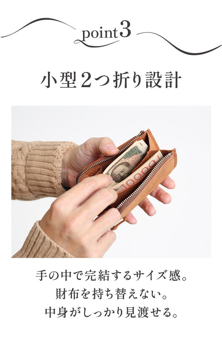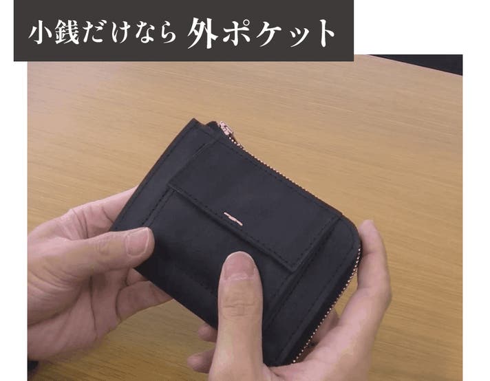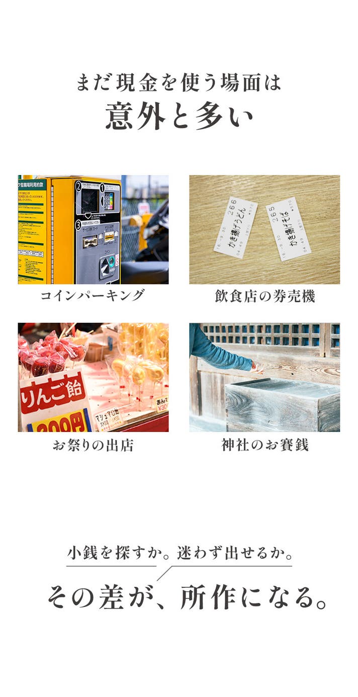 - 外から小銭へ直結。ファスナーを開けずに1アクションで決済。たまの現金払いのストレスを解消します