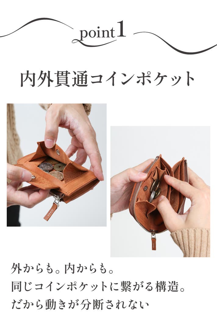このコインポケットが、少し特別な構造になっています。外側からも内側からもアクセスできる設計で、財布を開かなくても小銭に手が届く。そんな「思わず使ってみたくなる」仕掛けが、名前の由来にもなっています。