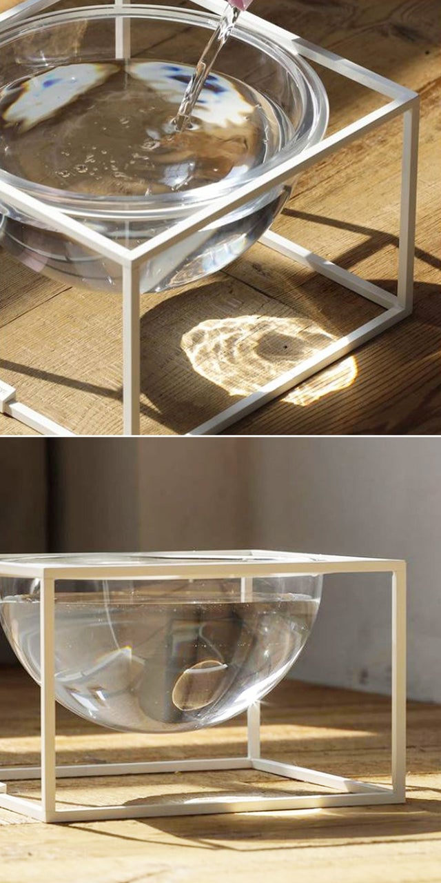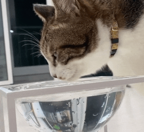 月光の器に水をいっぱい入れてみてください。その瞬間、ガラスのボールは巨大なレンズへと変わります。周辺に散らばっている光を集め、明るく鮮明な光の影を作ります。透明なガラスボールに入れられた水を通過する光の散乱は、猫に新鮮な水であると認識させます。それにより、安心して十分な水を飲ませることができるのです。