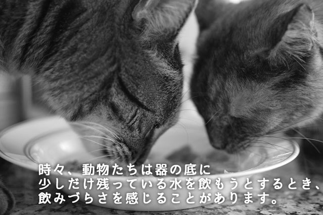 器の奥深くまで首を下げてから、舌が底につくまでが、水が飲みづらい主な要因になります。食器の縁が猫のヒゲにストレスを与えないよう、十分な広さでなければなりません。愛するペットの健康のために、残った水は捨て、毎日新鮮な水に替えてあげてください。^^