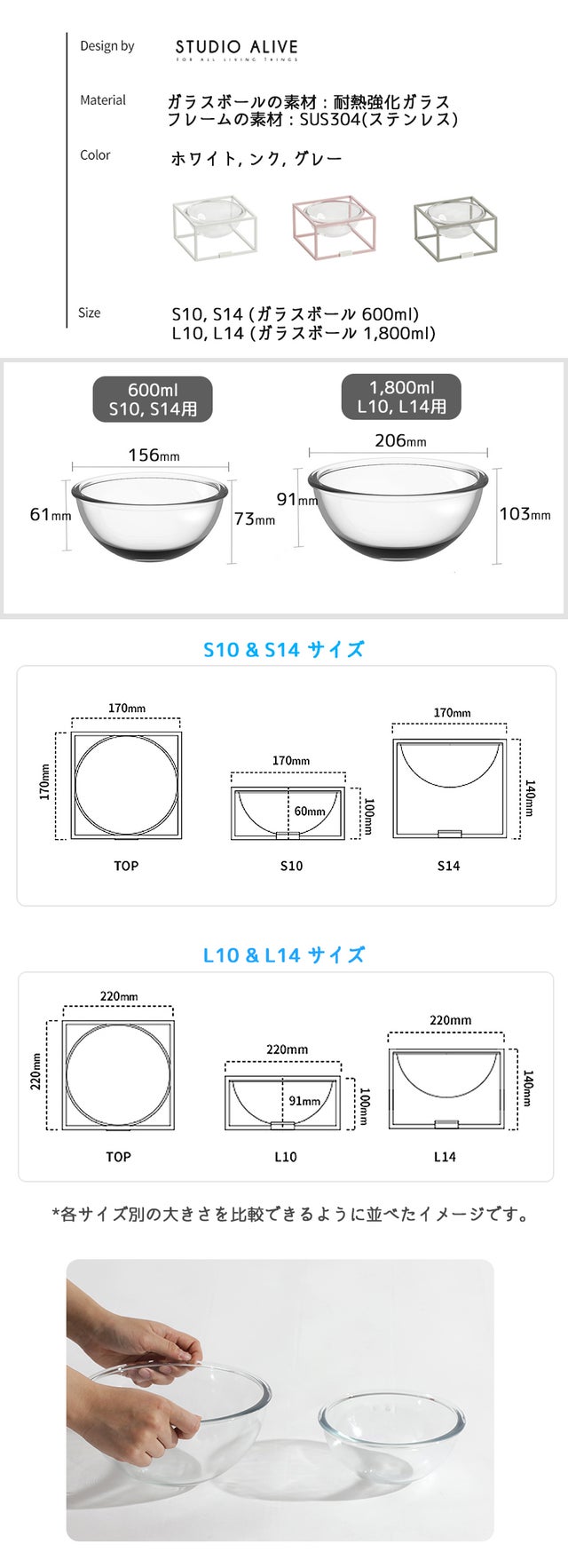 Studio Aliveの専用ガラスボールは、小さいサイズが600mL、大きいサイズが1,800mLの容量と、一日の摂取量に比べ大容量サイズに作られました。
