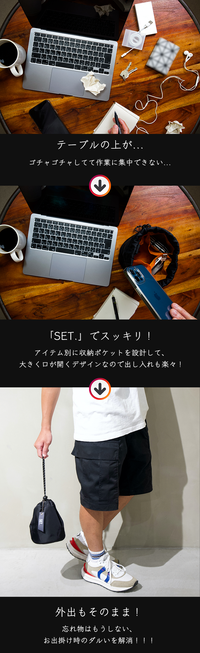 「SET.」は普段の生活をシンプルに余裕を持って過ごすをコンセプトに開発した部屋でも外出時でも車内でもこれひとつで対応できる多機能巾着バッグです。