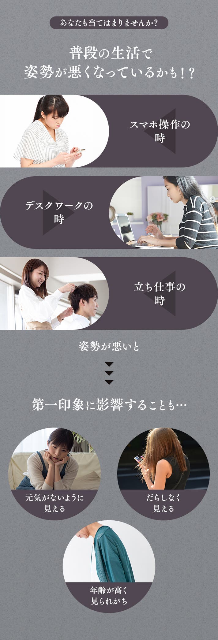 姿勢が悪いと第一印象が悪く見られてしまいます。元気がなく見えたり年齢が高く見られがち。