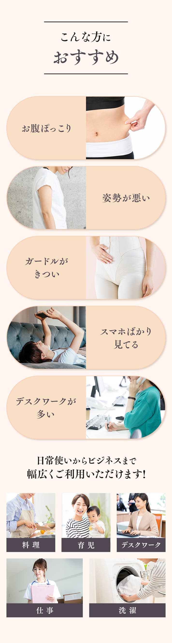 A.仕事中や自宅での炊事・洗濯のときはもちろん、通学中や通勤中、お買い物中や軽い運動をする際に着用してください。