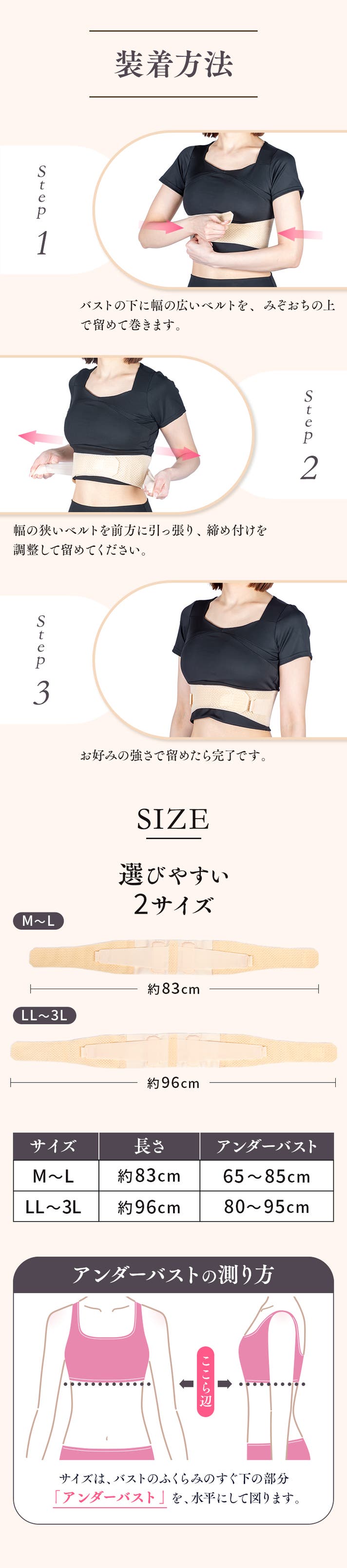 Step1.バストの下に幅の広いベルトを、みぞおちの上で留めて巻きます。