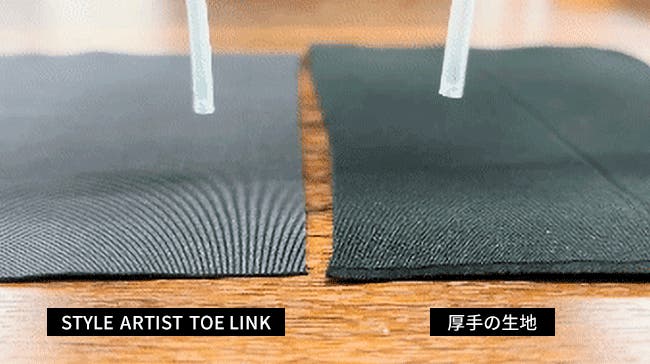 TOE LINKは、厚手の生地に比べて水分をすばやく吸収・発散しているのが分かります。