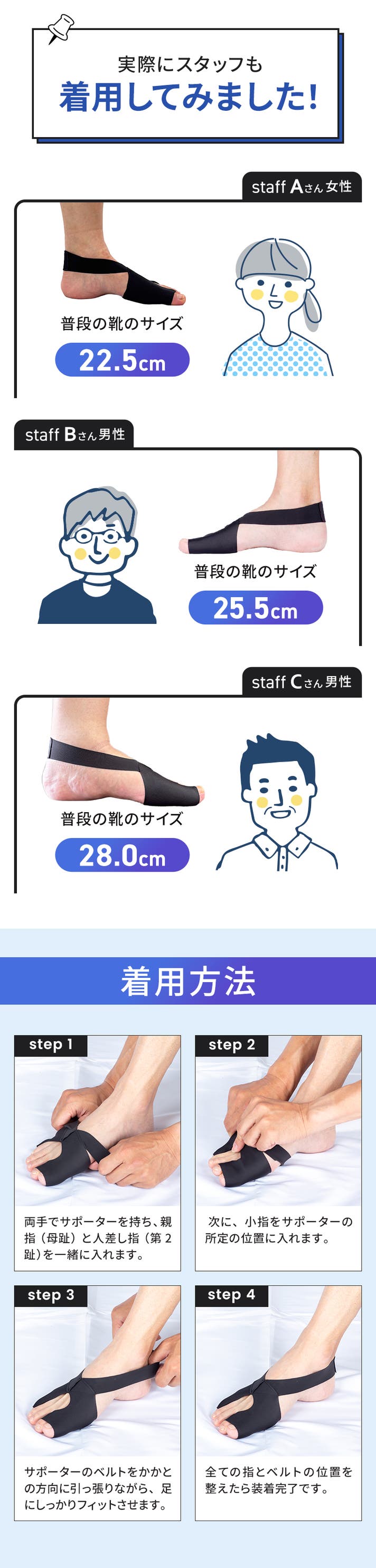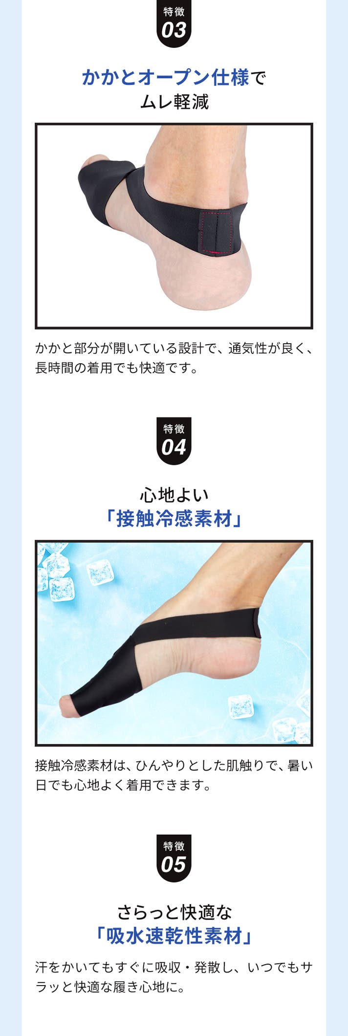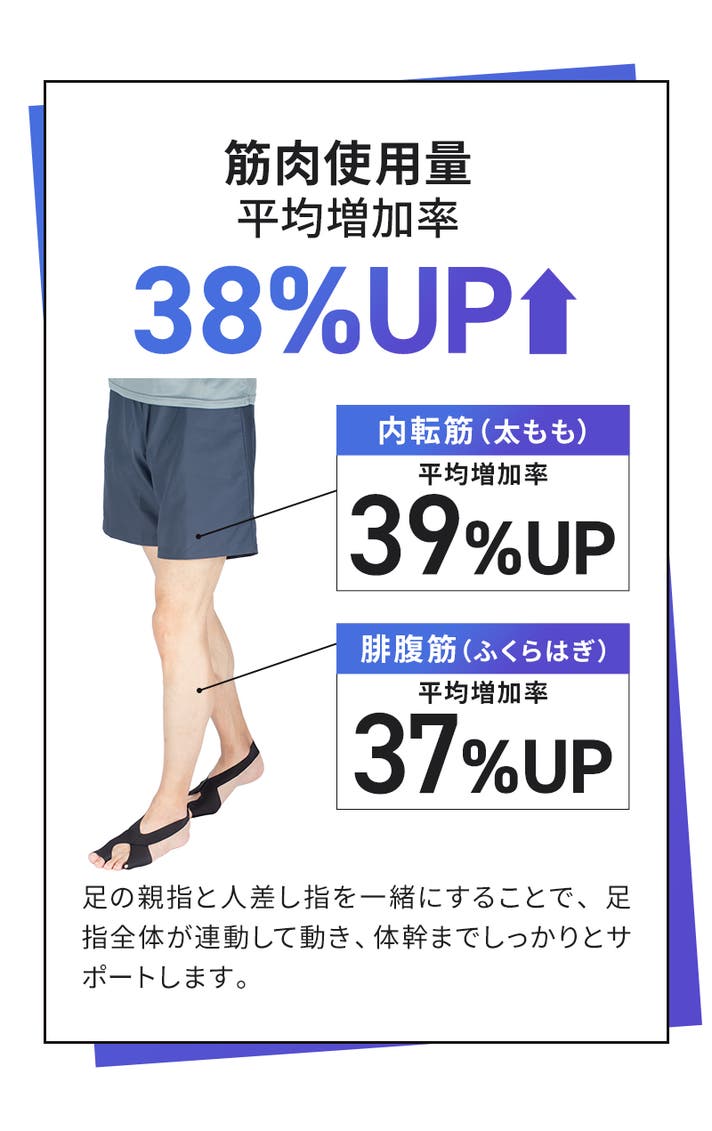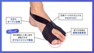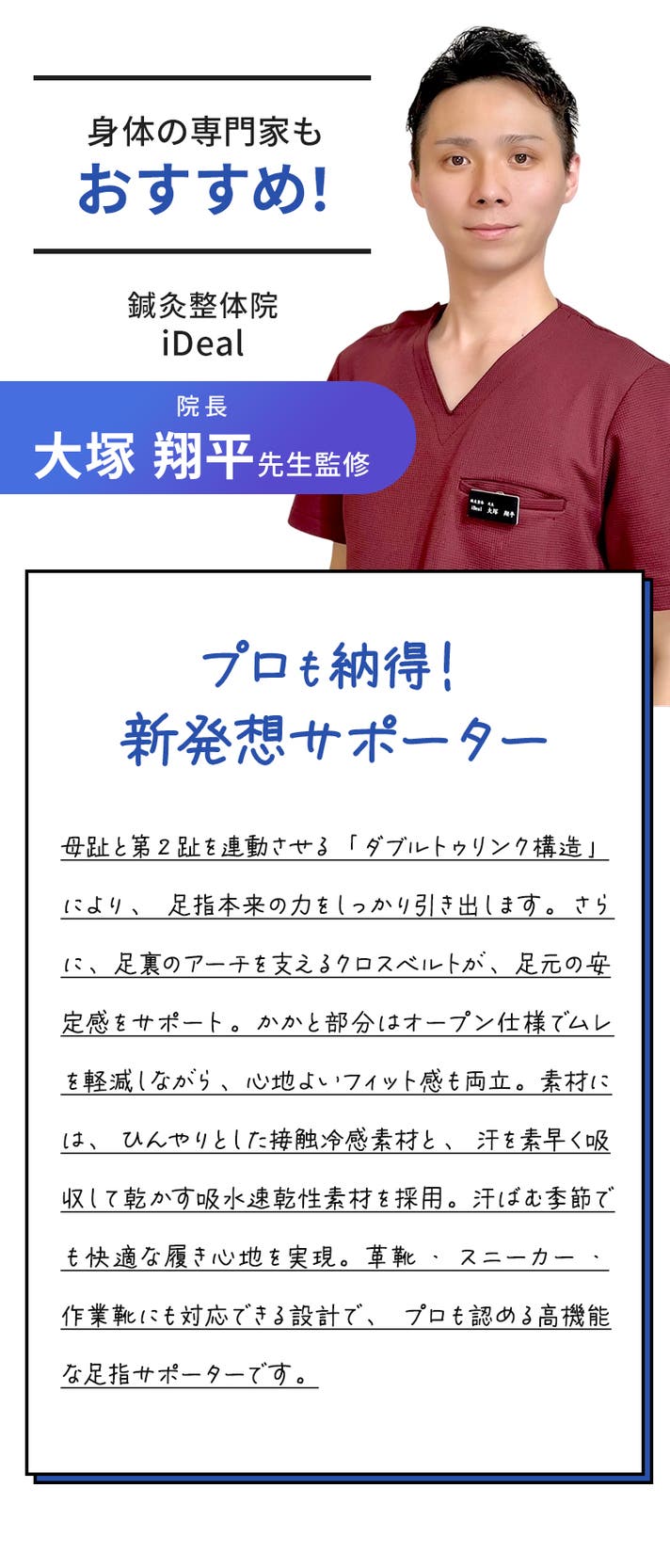 - 親指と人差し指をつなぐことで足指全体が連動し、足元から歩き姿勢を支える新発想のサポーター