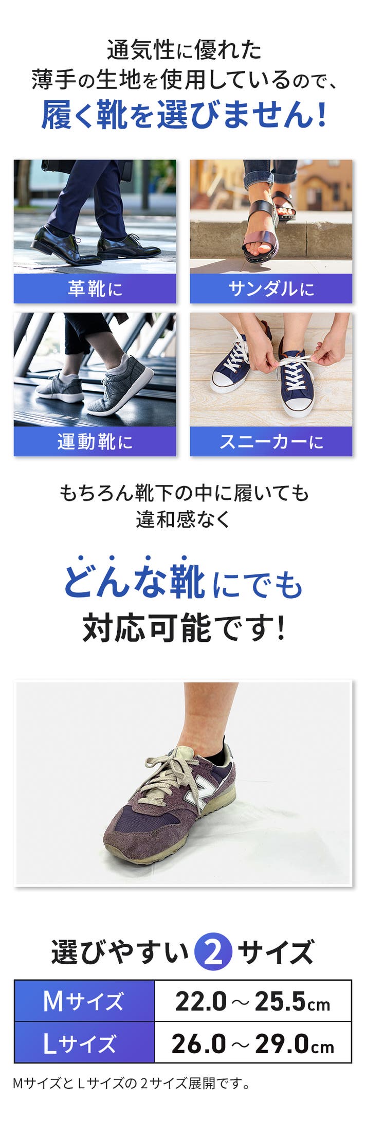 A. はい。通気性に優れた薄手の素材を使用しているため、靴下の中や靴の中でも違和感なく着用できます。革靴、スニーカー、サンダル、運動靴など、さまざまな靴に対応可能です。