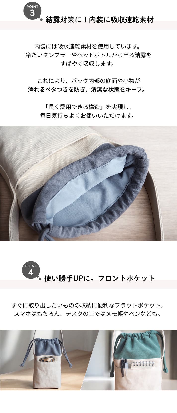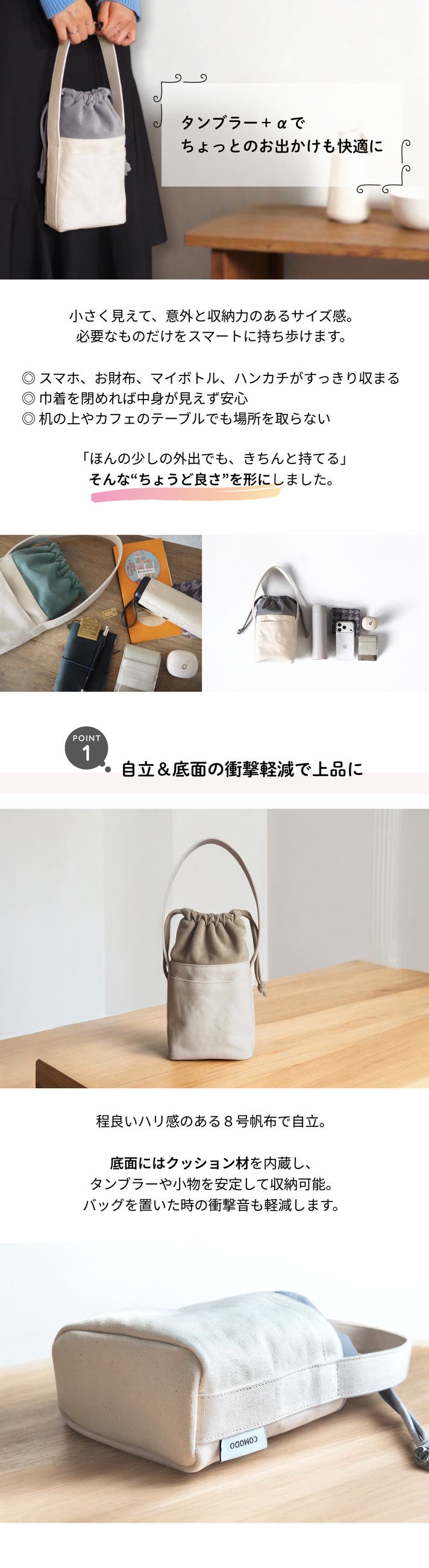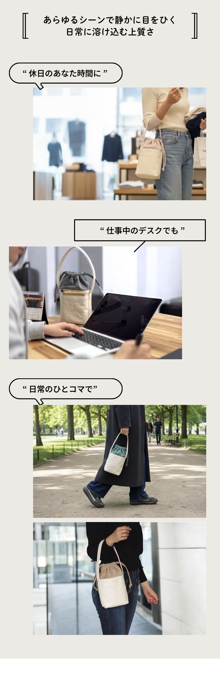 - マイボトル・財布・スマホがすっきり収まる設計。休日やカフェにも最適な、持ち歩きやすいサイズ感。