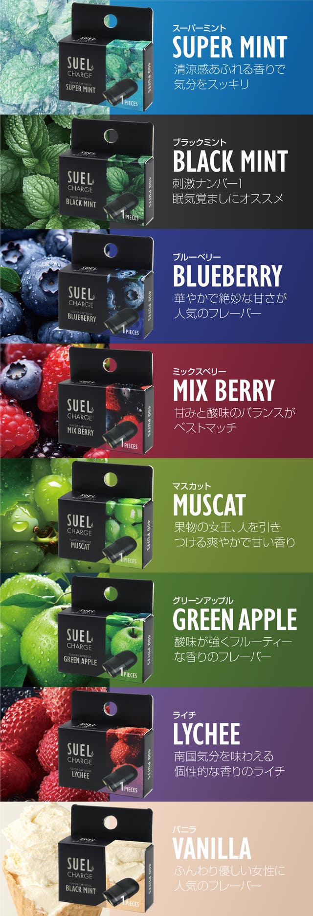 SUELの特徴でもある濃厚なフレーバーは全てメンソールベース。仕事の合間や休憩時間、家事や育児の休息にSUELで爽やかな気分になりませんか?