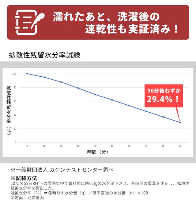 「呼吸する和紙靴下」の生地は、15秒で完全に沈みました。一般的な綿素材の靴下の生地は、完全に沈むまで58秒かかっています。「呼吸する和紙靴下」の吸水性は抜群によく、この特性がムレに強い要因になります。