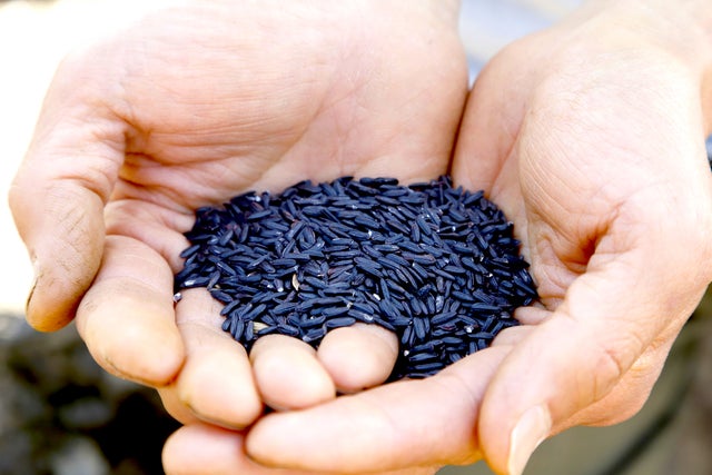 黒米は、糠にアントシアニン系の色素を含んでおり玄米が黒色をしています。赤米や緑米と同様に縄文時代から日本にある古代米で生命力が極めて強く、荒れ地で無肥料・無農薬でも丈夫に育ち、干ばつ・冷害などにも強いお米ですが、背丈が高いので台風には弱く、籾がこぼれ落ち易いため、収穫量が少ないという特徴があります。