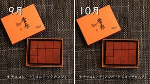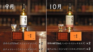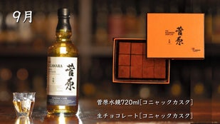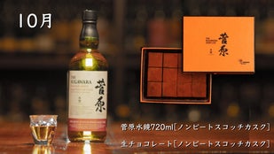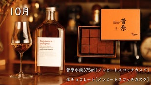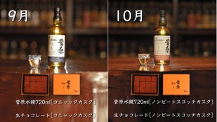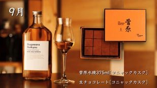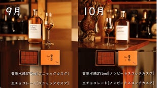 9月はコニャック マーテル カスク、10月はノンスモーキー モルトカスクシェリーをそれぞれ贅沢に使用。熟成が育んだ、甘い果実のような風味を感じられる「菅原水鏡後熟シリーズ」と生チョコレートの出会い。なめらかにとろける奥深い味わいと余韻を楽しむことができます。