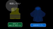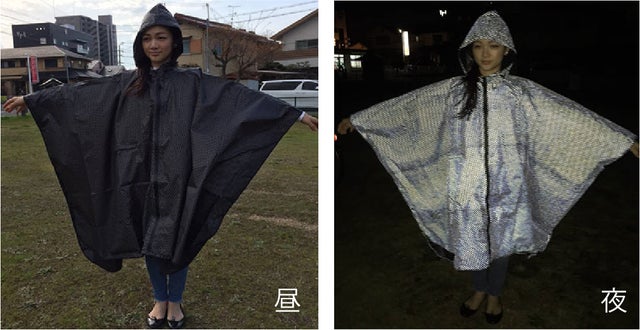 雨の日に着用するレインコートやポンチョの全体が光れば、車やバイクに認知してもらえるのではないか。