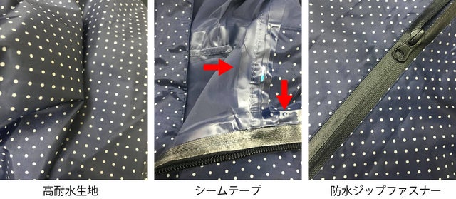 【耐水度】24000mm以上(縫い目にシームテープ、防水ジップ使用で継ぎ目も防水)