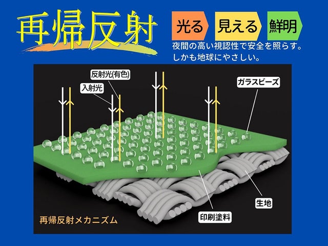 この技術を利用すれば、全身が反射するレインコートやポンチョを着ていれば、豪雨による洪水などの自然災害で、暗闇で救助対象の人々を探す際に、懐中電灯やサーチライトなどの光に全身が反射すると、救助に必要な時間が軽減され、救護される側も、救護する側も、リスクを軽減されます。