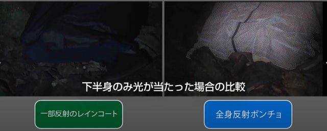 全身が反射するということは、遠い所からでも、裾の小さい部分にライトが当たっても捜索隊から認知できるということです。