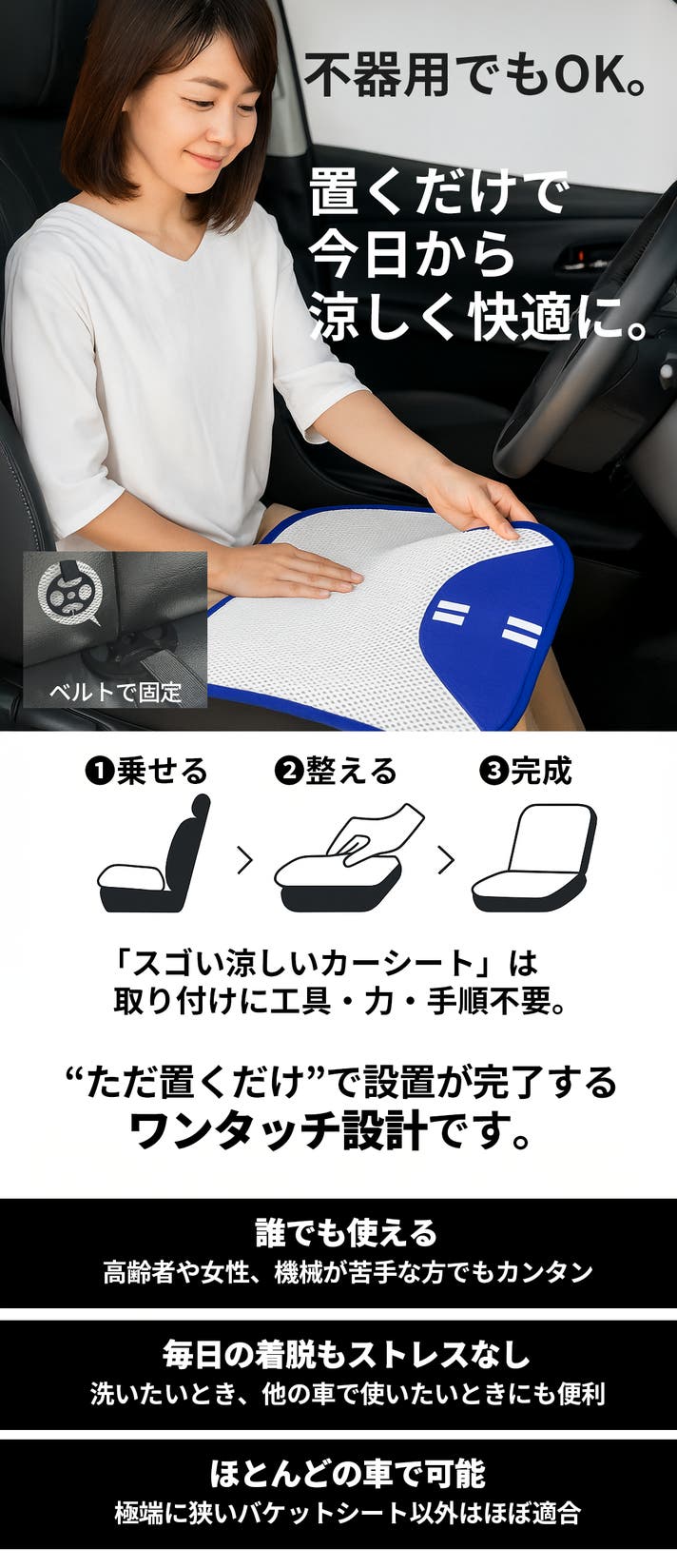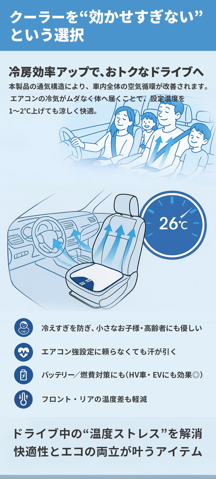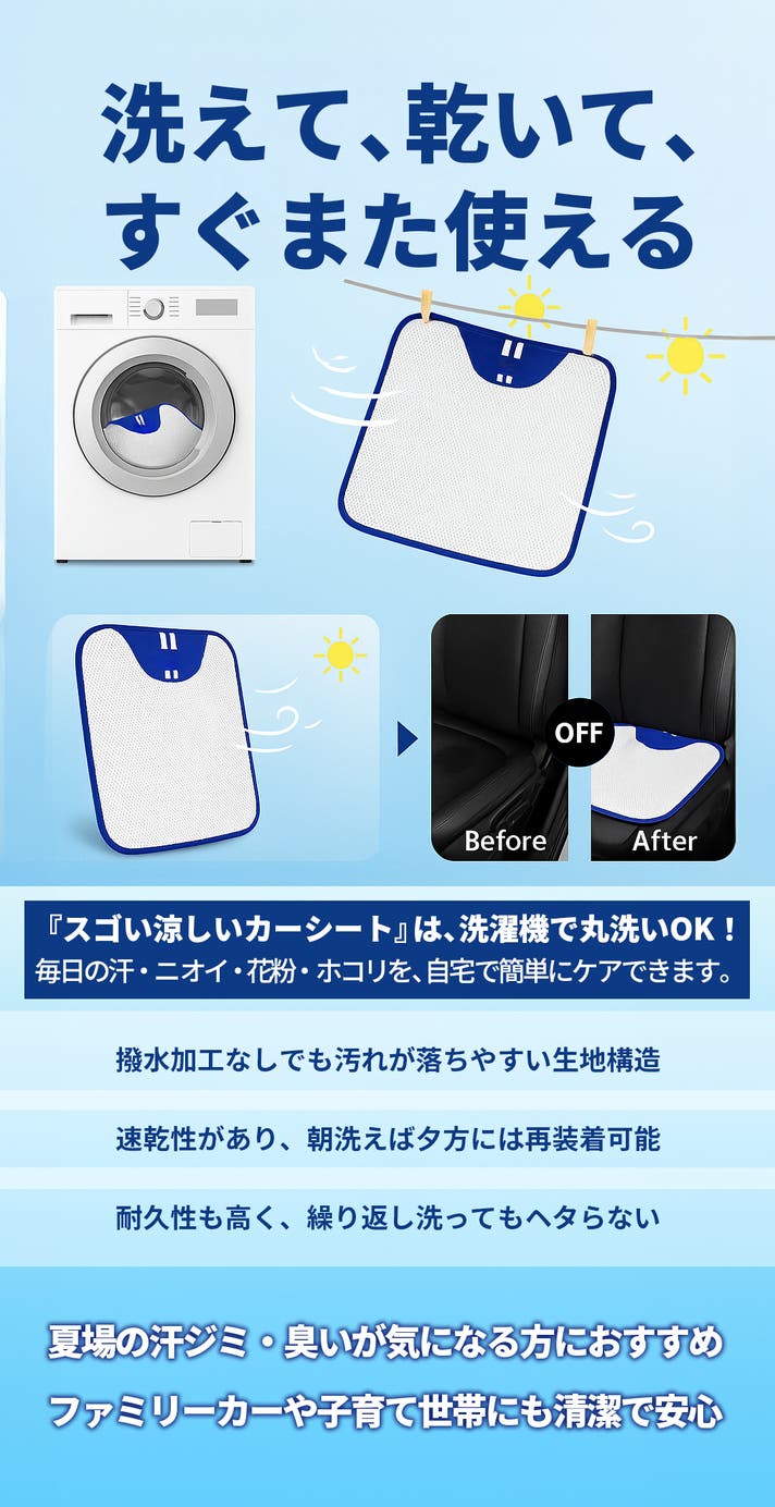 このスゴい涼しいカーシートは、夏の背中からお尻にかけてのいやーな暑さをスッキリさせたいなぁと言う思いから誕生しました。