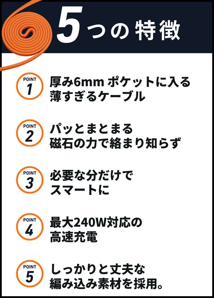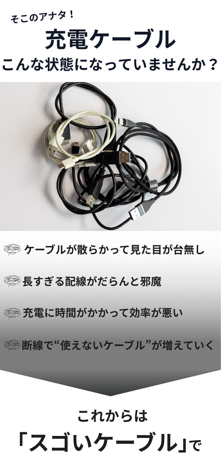 このスゴいケーブルは、磁力で自然にまとまり、絡まらずスマートに収納できる次世代ケーブルです。