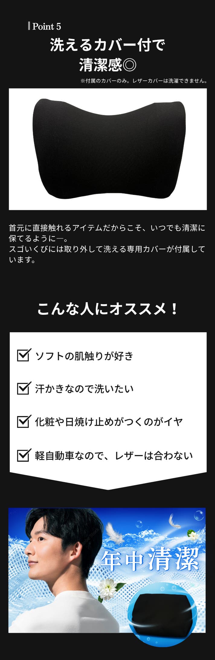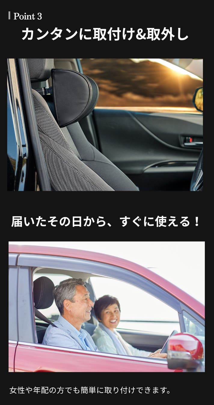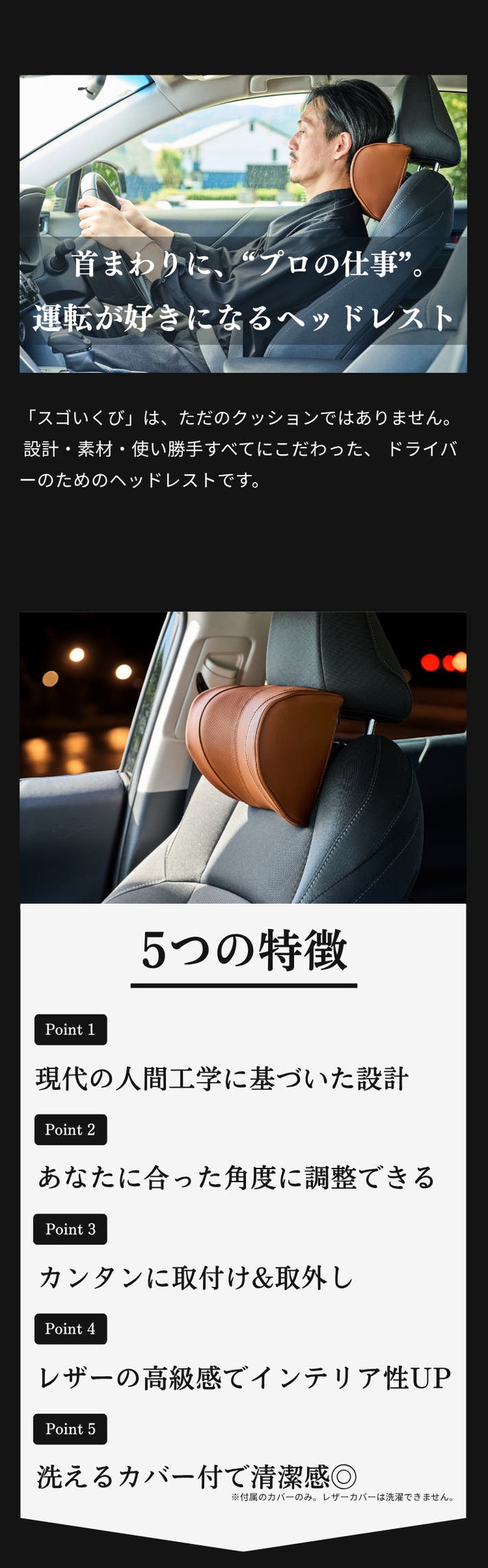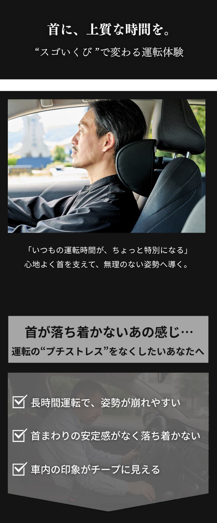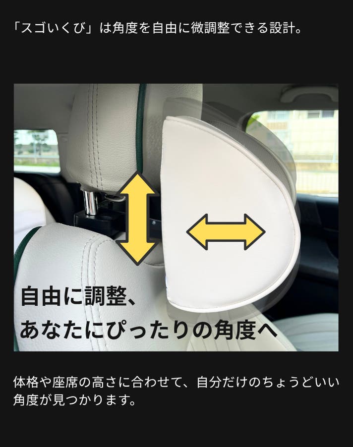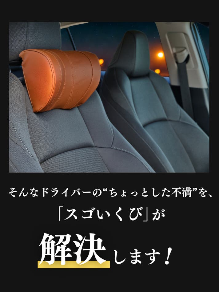 このスゴいくびは、首に自然にフィットし、角度調整もできる車用ヘッドレストです。工具不要で簡単に装着でき、車内の雰囲気も上質に整います。