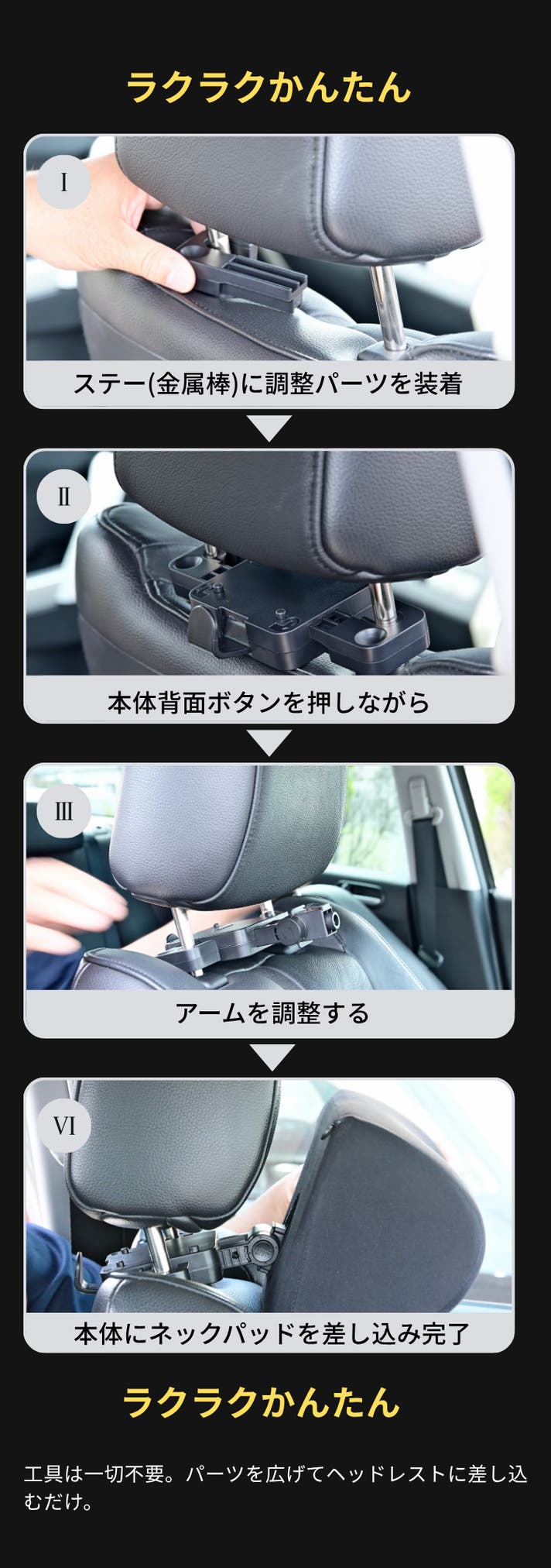 A. 工具は不要です。ヘッドレストのポールに差し込むだけで、どなたでも簡単に取り付けできます。