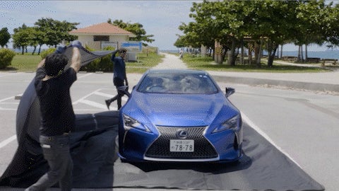 ひろげて、車を丸ごと包み込む。浸水から車を守る。