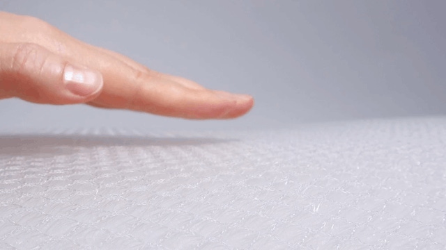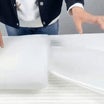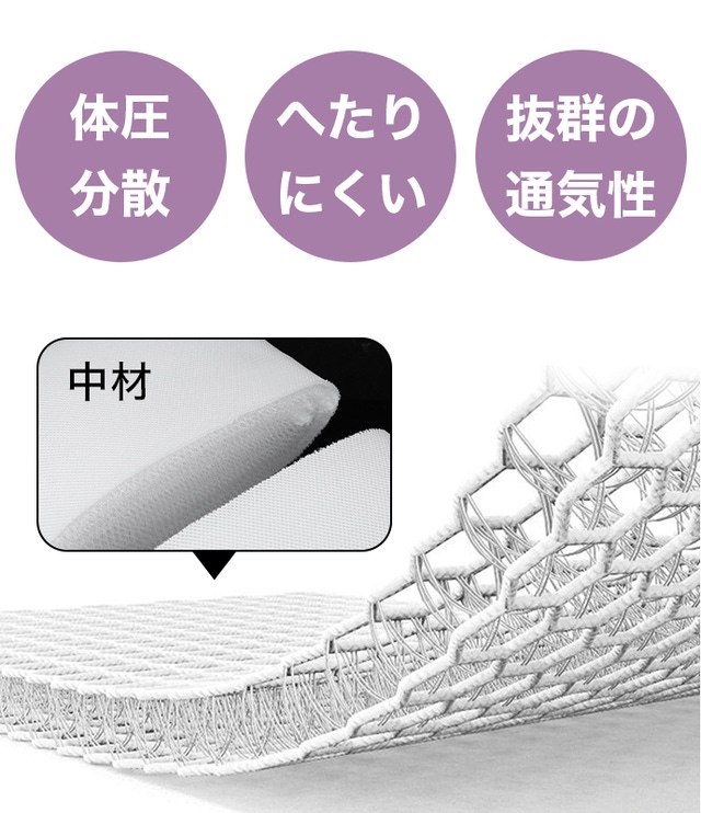中材は、ポリエステル繊維がループを描きながら、三次元方向に絡み合った構造を採用しています。