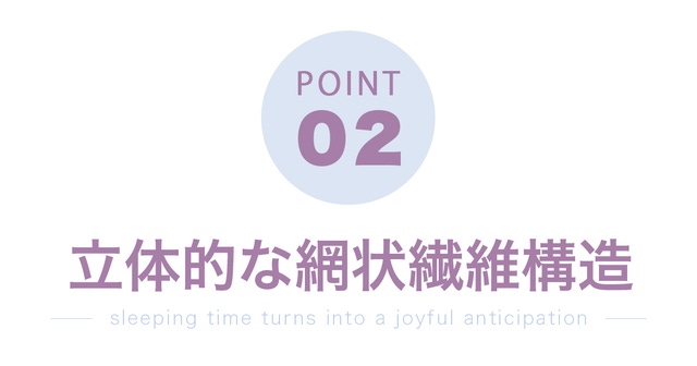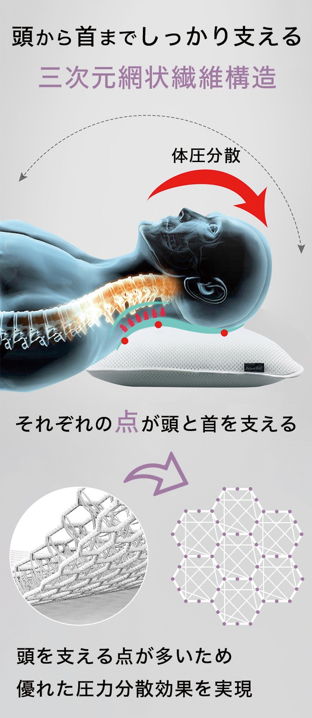 きめ細かい三次元網状繊維構造は表面格子点の数が多いので、仰向けでも横向きでも頭部と頸椎をしっかり支え、頭や首にかかる圧力を均等に分散させることができます。