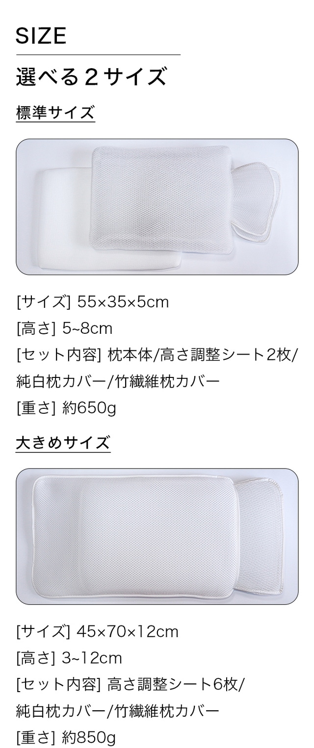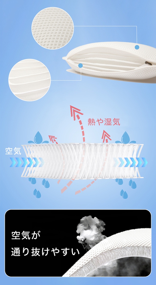 - 三次元網状繊維構造で圧倒的な通気性と体圧分散性を両立。お好みに合わせて枕の高さを調整可能。