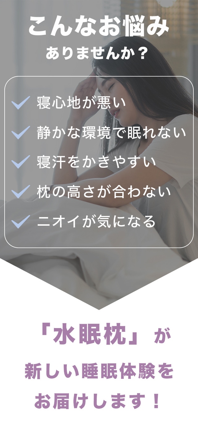 そこで、皆様の質の高い睡眠環境をサポートするために、優しく流れる水の音を取り入れた新感覚の枕「水眠枕」が誕生しました!