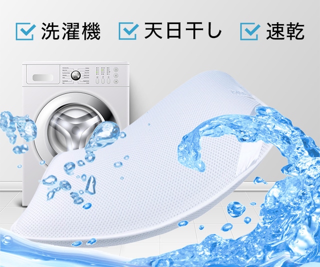枕カバーはもちろん、中材もそのままご家庭の洗濯機に入れて丸洗いができるので、いつも清潔に心地よくお使いいただけます。