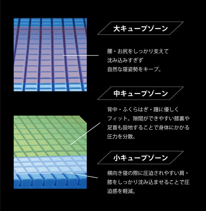 硬さをカスタマイズした独自の3Dキューブカット構造。