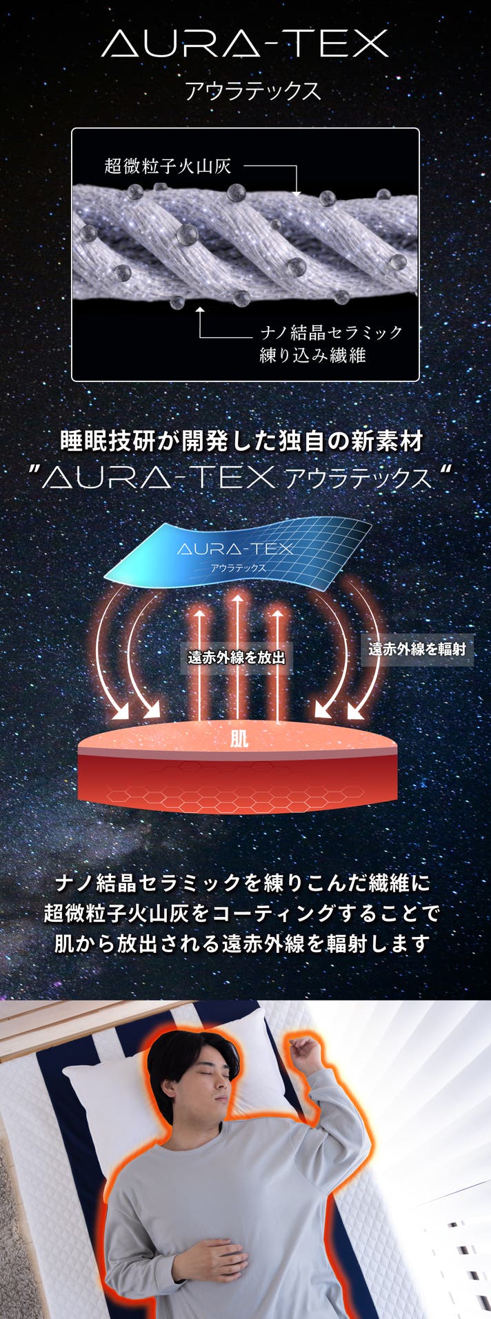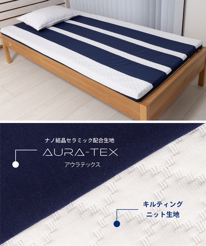 マットレスの表面生地に、同時発売の"ねむる惑星 リカバリーウェア"で使用しているナノ結晶セラミック配合の新素材“AURA-TEX”を使用。