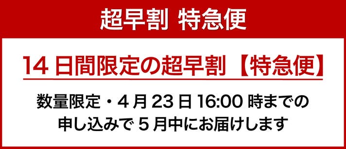 4月23日16時までにご注文いただいた方に限り、5月末までにお届けする特急便です。