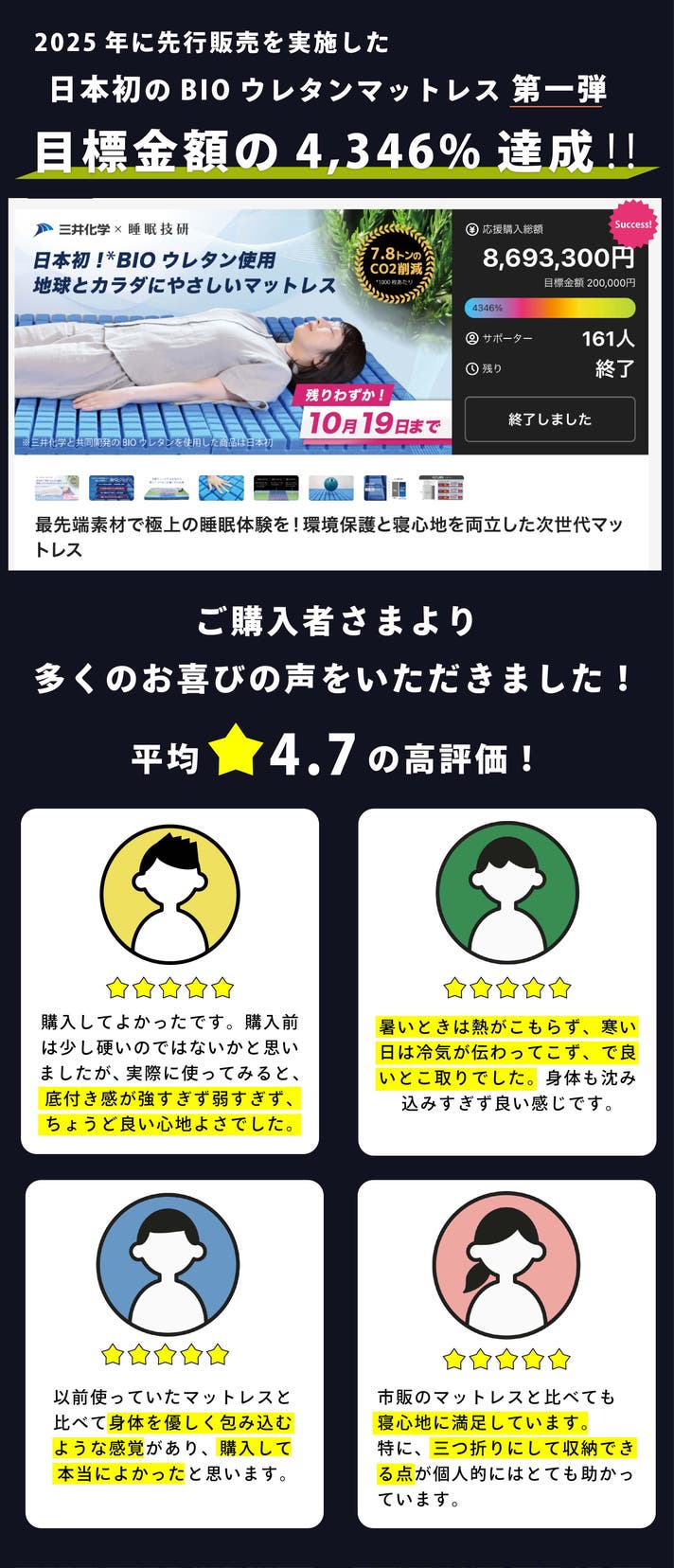 - 昨年、目標額の4,000%を達成した大好評のBIOウレタンマットレスから待望の第二弾が登場!
