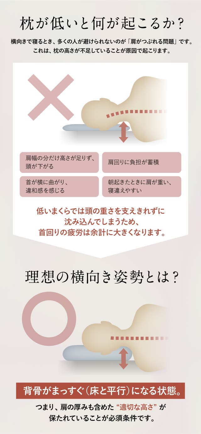 横向きで寝るときに、多くの人が避けられないのが「肩がつぶれる」問題です。