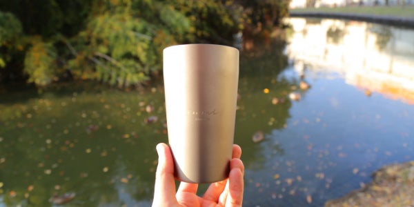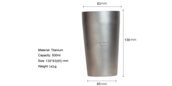 素材は純チタンで製造。500mlという大容量サイズなので、ペットボトル1本分相当の飲み物がお楽しみいただけます。また、重さは143gとかなり軽量なので、持ち運びにも便利。サイズは底65mm×上部83mm×高さ139mm。