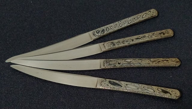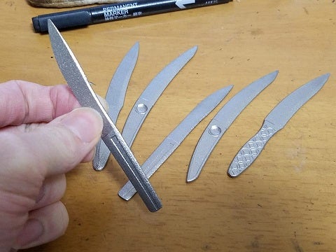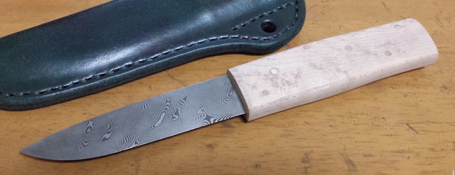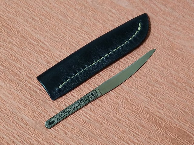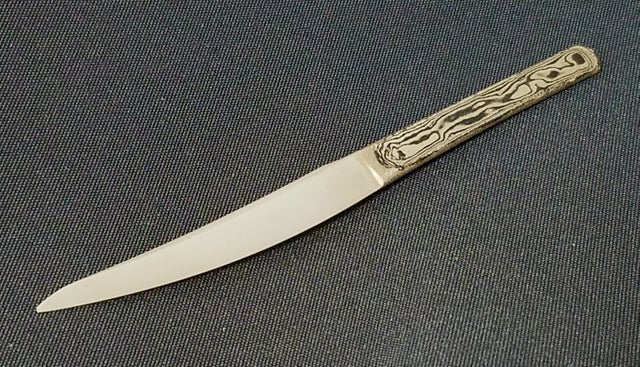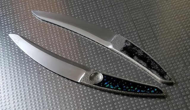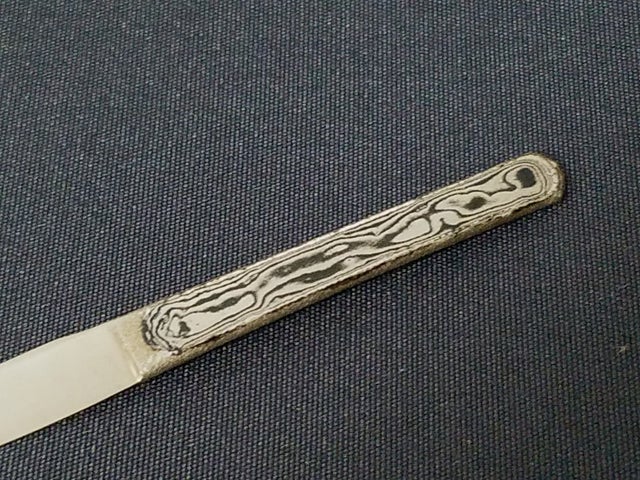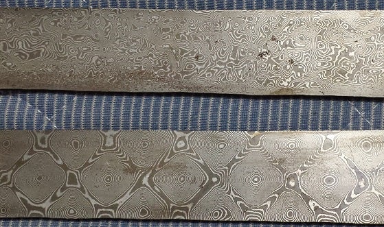 ナイフや包丁を作る際の鋼材の中で、異なる2種の鋼材をパイ生地のように重ねた積層鋼材、ダマスカス鋼材というものがあり、それは削る角度や捻り・穿孔等の加工によって様々な模様が出ます。