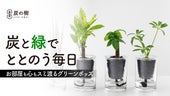 細かく砕いた炭に植物を植えた観葉植物。水はヒモから吸い上げるので、水やりのタイミングが一目瞭然。面倒な土いじりや、水のやりすぎ・やり忘れの心配もいりません。