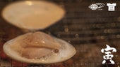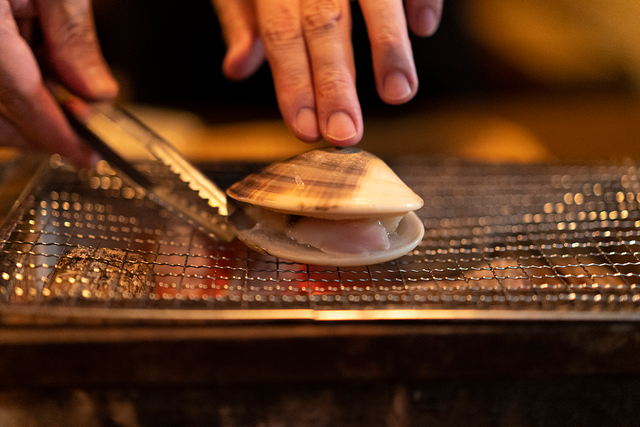 炭火の上の蛤が焼き上がる様子を眺めながらの一杯は格別。