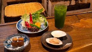 生野菜 自家製豆板味噌付き+串焼き(うずらの玉子/玉こんにゃく)+九十九里浜 地蛤