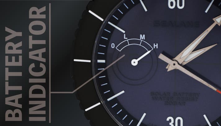 9時位置には蓄電残量が一目で分かるバッテリーインジケーターを装備し、充電不足の際は秒針が2秒間隔で動く警告機能付き。