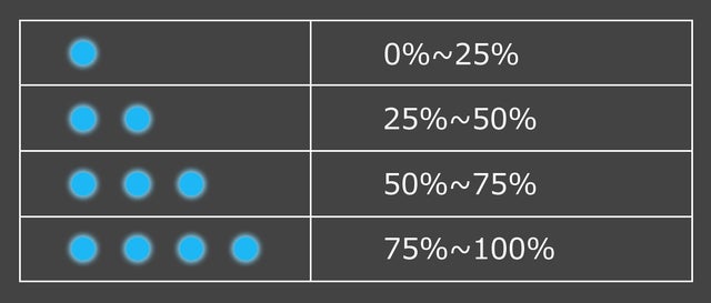 電源スイッチを1回押すと4つのインジケーターライトでバッテリー残量が表示されます。